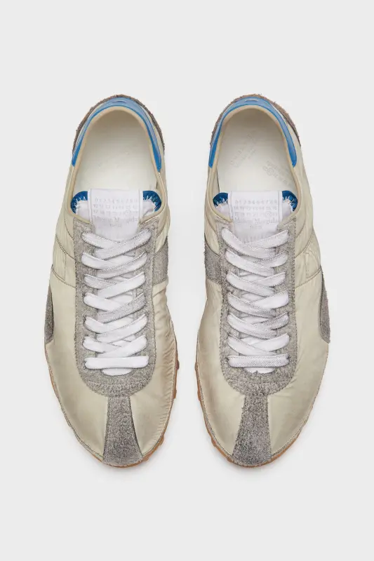 Crafted from nylon, suede and calfskin – with a vintage treatment – the Sprinters silhouette is inspired by retro running shoes. Block colour contrast is met with the classic tongue displaying the numeric logo. The cleated sole also features number detailing with the 22 encircled indicating the Maison's footwear collection. Maison Margiela's signature stitch appears at the back.