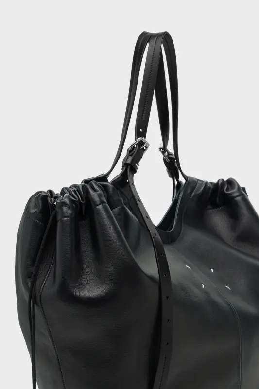 Crafted in soft nappa leather, this oversized shopper merges volume with structure. The gathered top softens its angular form, while belt-inspired leather handles lend a utilitarian edge. A detachable pouch tucks inside, designed for everyday essentials. At the front, the Maison’s signature four stitches appear; the opposite of a label.