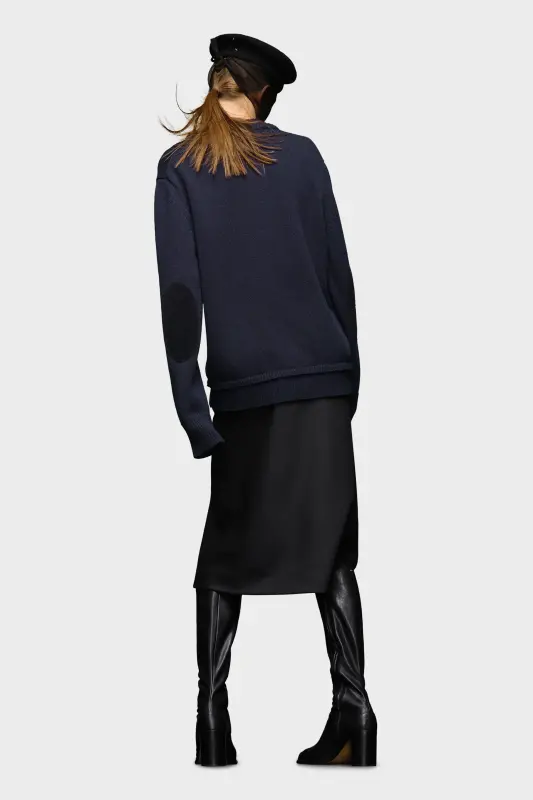 This crew-neck knit sweater with long sleeves and ribbed trims features tonal elbow patches. At the back, four white stitches show the hand of the Maison: the opposite of a label. Gauge 5.