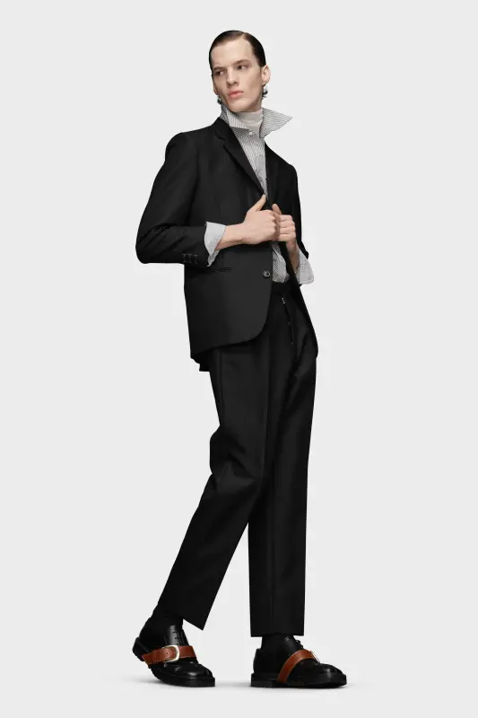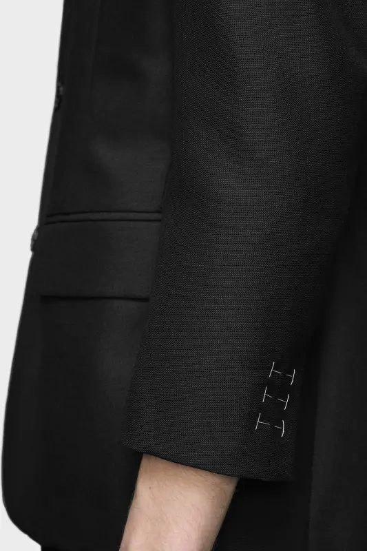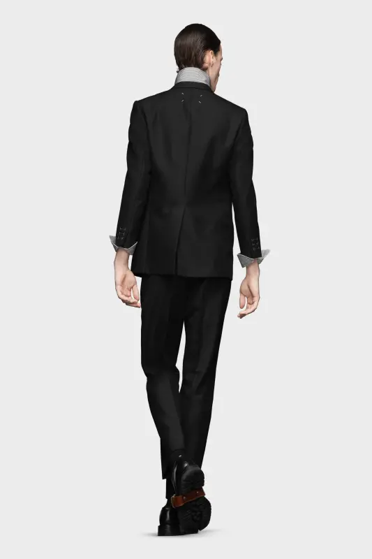 Crafted from British mohair, the blazer is single-breasted with three buttons. A back vent offers movement, while the front has a notched collar and flap pockets. The Maison's Work-in-progress stitches are seen at the cuffs for an unfinished aesthetic that offsets the classic tailoring. Maison Margiela's signature, the Four stitches, appear at the back; the opposite of a label.