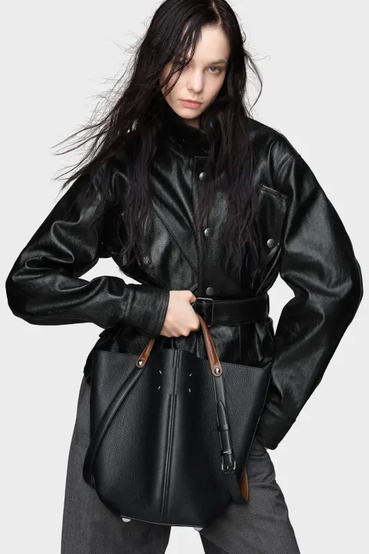 The Maison launches the Dress-age handbag for SS25, crafted from soft pebbled calfskin. With an equestrian spin, the medium handbag features classic leatherwork and refined lines, combining unconscious glamour with gestural design. It follows a trapezoid shape with contrast dual-wear strap detail. The studded base allows the bag to stand, and the inner is adorned with the logo. Maison Margiela's signature, the four stitches, appear at the back; the opposite of a label.