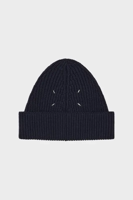 Fisherman-inspired beanie hat in a wool-cotton blend with compact English rib stitch. The Maison's four-stitches moniker adorns the front.