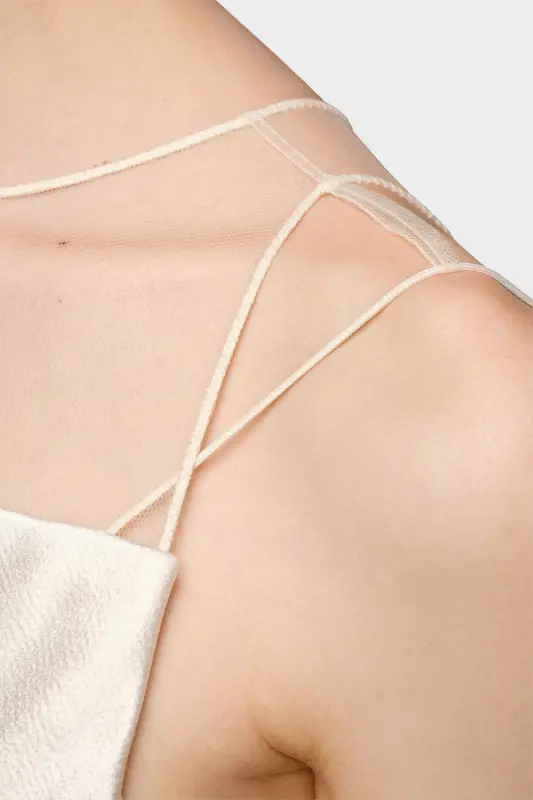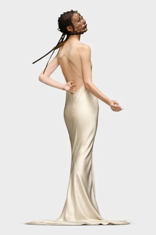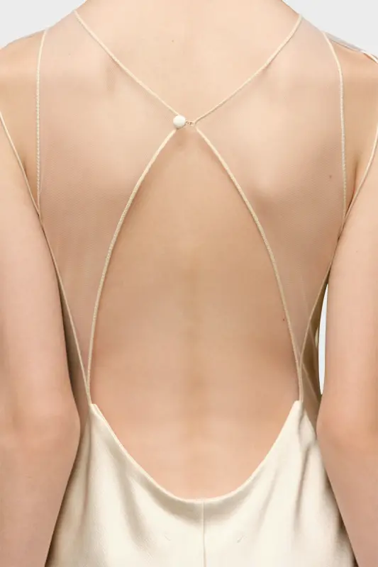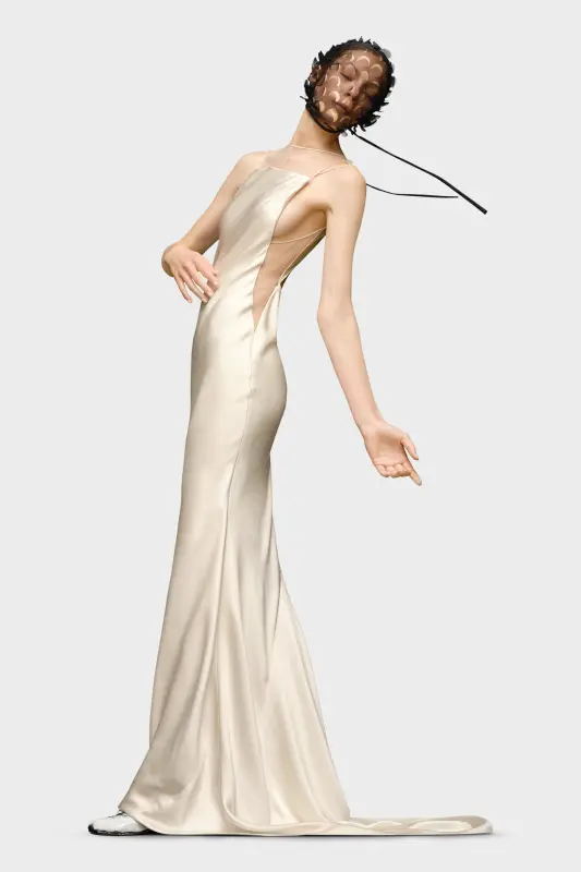 In hammered satin, this maxi dress which pools on the floor, follows a sleeveless design with a boat neck. Sheer panelling features at the chest and around the back, with a large cut-out. It's finished Four white stitches show showing the hand of the Maison: the opposite of a label.