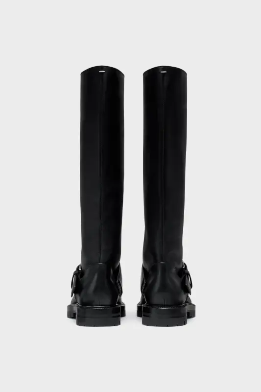 Inspired by vintage workwear, these knee-high Tabi boots are made from supple leather with a functional ankle strap and durable rubber sole. They feature the Tabi split-toe, inspired by the traditional 15th century Japanese sock bearing the same name – launched for the Maison's debut collection in 1989. It captures the avant-garde and insubordinate spirit of the Maison and exists as a heritage classic, continually explored through each collection. Maison Margiela's signature single white stitch appears at the back.