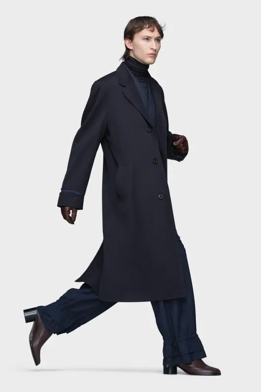 This single-breasted coat is crafted from wool in a tailored silhouette. It features structured shoulders and a narrow lapel, with exposed seams that trace the lines of construction – a nod to the Maison’s Décortiqué technique. Maison Margiela’s signature, the four stitches, appear at the back; the opposite of a label.