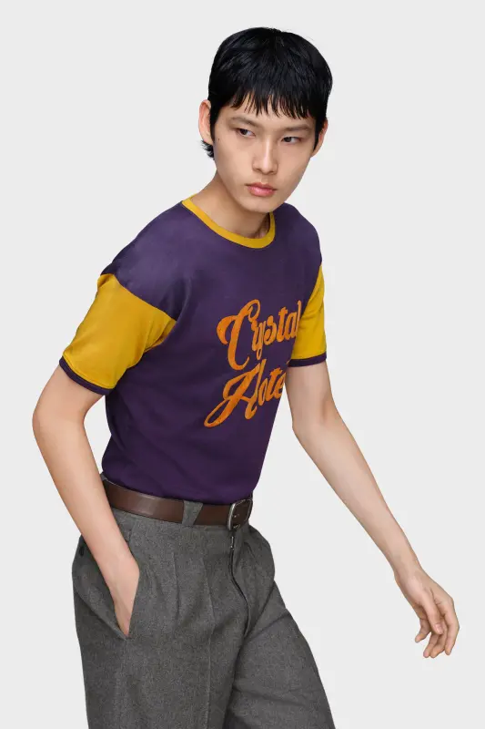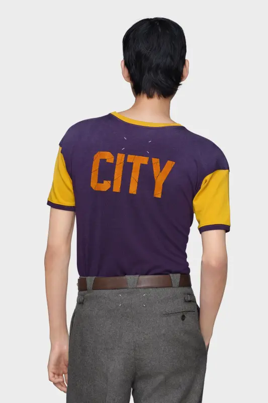 This two-tone t-shirt is printed with a retro “Crystal Hotel” logo in crackled print, echoing the nostalgic language of holiday memorabilia. Its soft construction and tonal collar draw from vintage athletic styles, reinterpreted with subtle disruption. Maison Margiela’s signature, the four stitches, appear at the back; the opposite of a label.