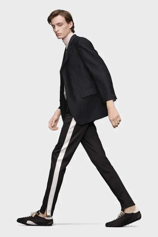 Crafted from mohair wool, the suit jacket is single-breasted and features a notched collar. It is completed with flap pockets at the sides and a chest pocket. The cuffs are designed with the work-in-progress contrast stitching, offsetting the tailored aesthetic. Maison Margiela's signature, the four stitches, appear at the back; the opposite of a label.