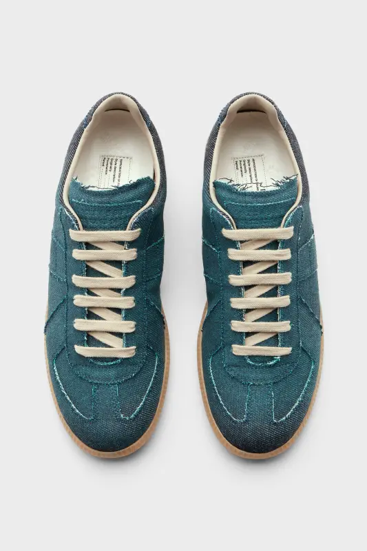 Crafted in raw-edge denim, these Replica sneakers are defined by exposed threads that trace the outline of each seam. A faded side panel acts as reference to the Maison’s Memory of technique, highlighting traces of past construction. The Maison's iconic Replica sneakers are inspired by Austrian sports shoes from the seventies. Details on the Replica pairs are continually reworked in line with the season's inspirations.
