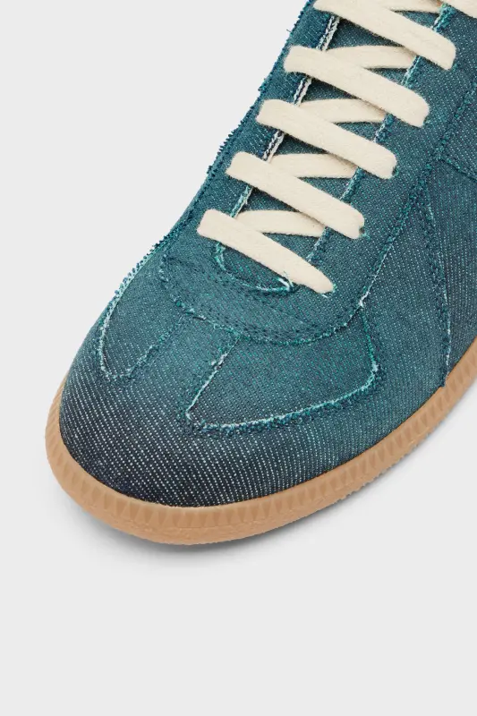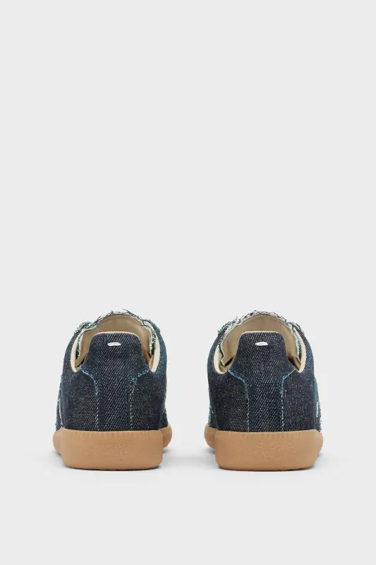 Crafted in raw-edge denim, these Replica sneakers are defined by exposed threads that trace the outline of each seam. A faded side panel acts as reference to the Maison’s Memory of technique, highlighting traces of past construction. The Maison's iconic Replica sneakers are inspired by Austrian sports shoes from the seventies. Details on the Replica pairs are continually reworked in line with the season's inspirations.