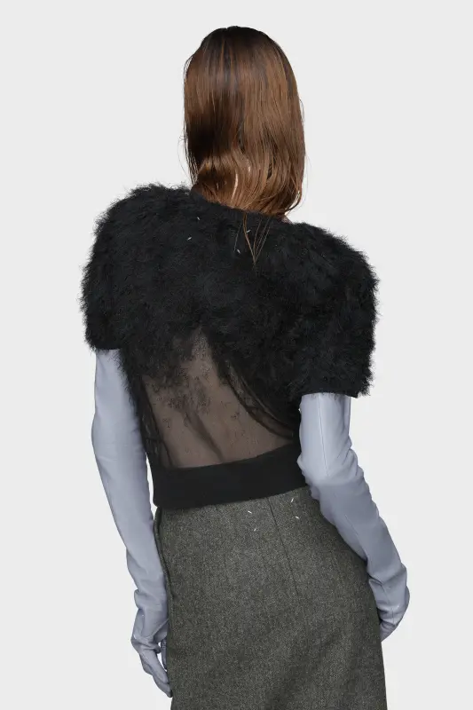 This short-sleeved top is crafted in silk knit with a textured finish that fades through the body – an expression of the Maison’s retrograding technique. The ribbed waistband and round neck create a neat contrast to the airy surface. At the back, the Maison’s signature four stitches appear; the opposite of a label.