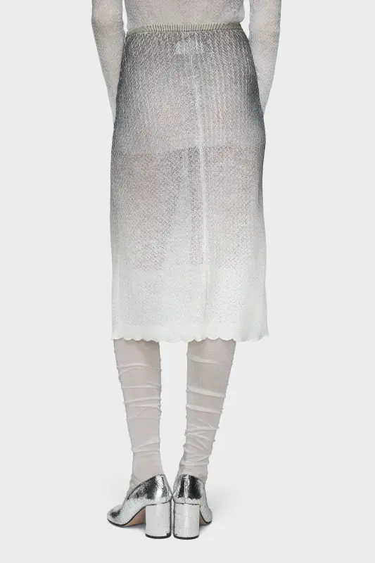 A midi skirt in a fine wool blend, its silhouette defined by tonal gradation and sheer construction. The knit dissolves in weight as it descends, revealing texture and transparency. At the back, the Maison’s signature four stitches appear; the opposite of a label.