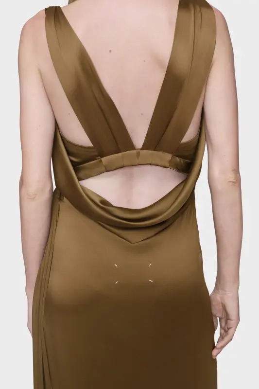Defined by its fluid silhouette, this silk maxi dress combines architectural draping with liquid-like satin. Side gathers and an asymmetric knot introduce movement, while wide straps fall to reveal an open back. At the back, the Maison’s signature four stitches appear; the opposite of a label.