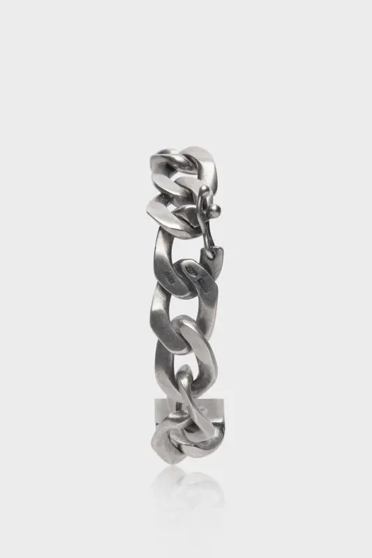 An interlocked chain bracelet, crafted from semi-polished silver, with a smooth tag across the front.