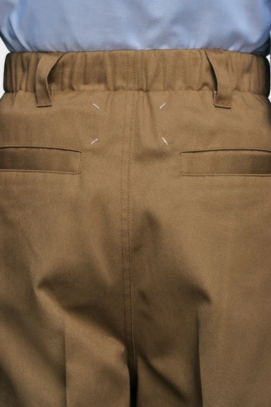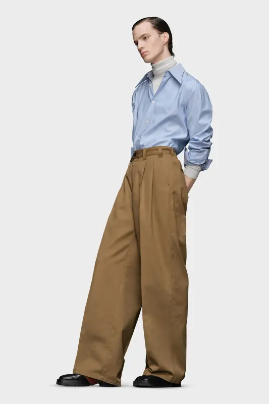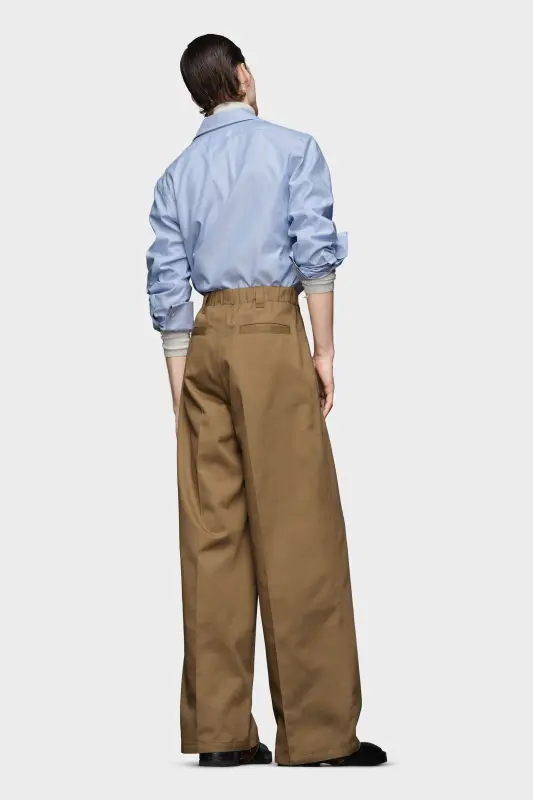 With a high-waist and pleats, the wide skater chino trousers feature the Margiela hook. The back is elasticated, with side and back pockets. Maison Margiela's signature, the Four stitches, appear at the back; the opposite of a label.