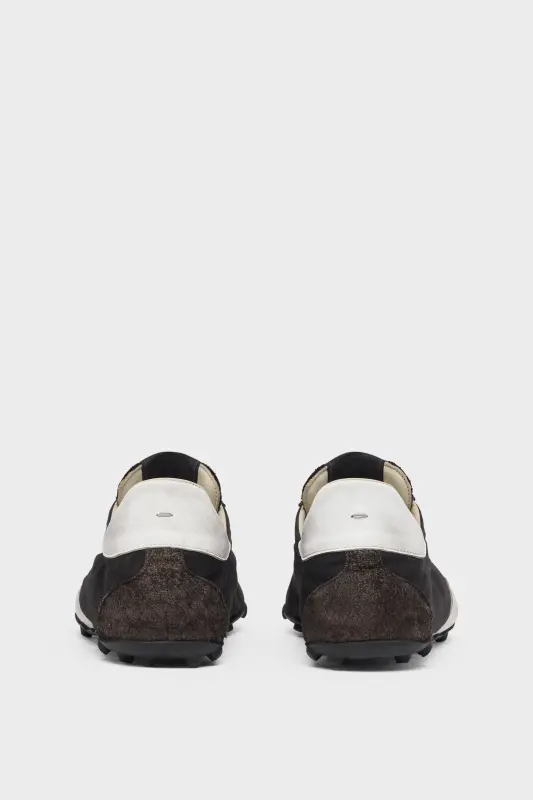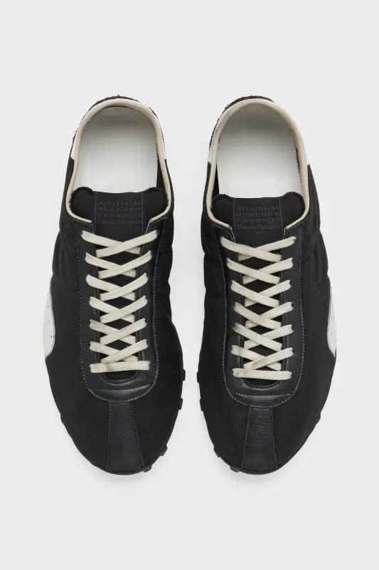 Crafted from drill, hairy suede and calfskin with a vintage treatment, the Sprinters silhouette is inspired by retro running shoes. Block colour contrast is met with the classic tongue displaying the numeric logo. The studded base also features number detailing with the 22 encircled indicating the Maison's footwear collection. Maison Margiela's signature stitch appears at the back; the opposite of a label.