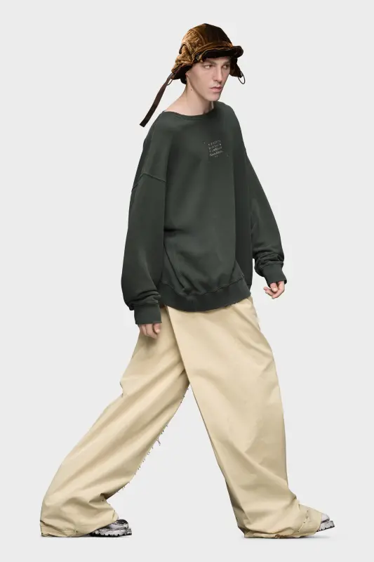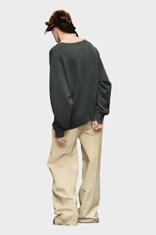 The sweatshirt comes in cotton with dropped shoulder seams and an oversized silhouette for a relaxed take. It has ribbed trims with distressed edges for a worn-in look. Across the chest, the stamped numeric logo appears deliberately faded in parts. Maison Margiela's signature, the four stitches, appear at the back; the opposite of a label.