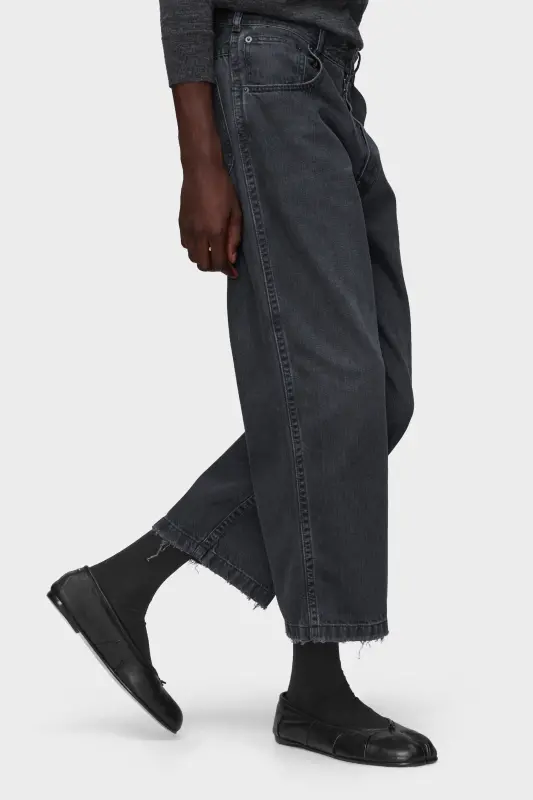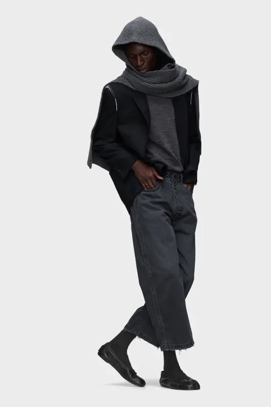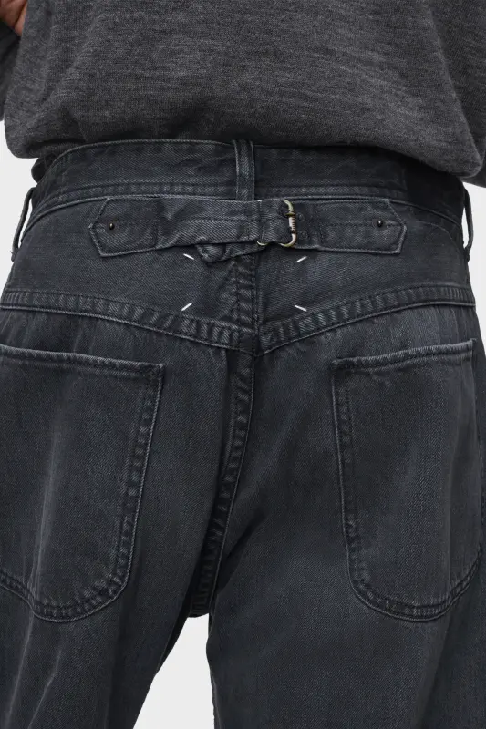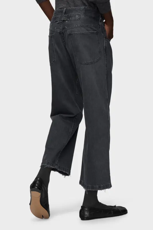 These straight-leg jeans combine a relaxed, cropped leg and subtle flare with a raw-cut hem for an undone finish. The back buckle detail recalls workwear tailoring, while the memory of the jacron label highlights the Maison’s approach to absence as design. At the back, the Maison’s signature four stitches appear; the opposite of a label.