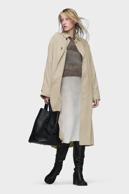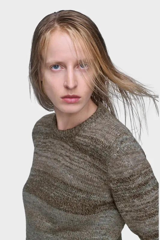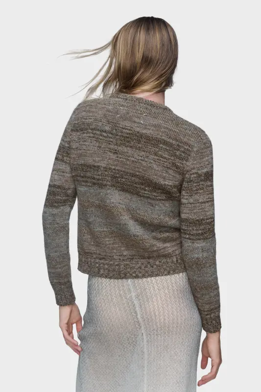 Knitted in virgin wool, this crewneck sweater reveals a play of tonal shifts that form soft horizontal striations. Ribbed trims frame the silhouette, grounding the piece in quiet structure. At the back, the Maison’s signature four stitches appear; the opposite of a label.