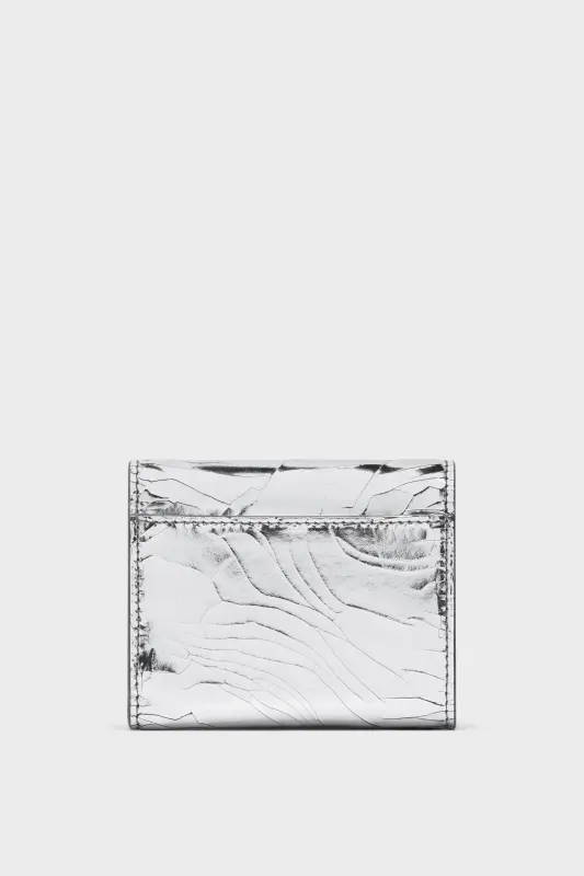 This trifold wallet is crafted in Broken Mirror material, defined by a crackled, light-catching surface that shifts with movement. Inside, a press-stud flap reveals card slots, a coin pouch, and space for notes. On the front, the Maison’s signature four stitches appear; the opposite of a label.