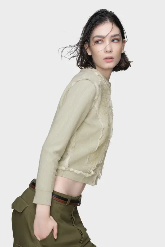 This cardigan is framed by contrast, with appliqué patches that resemble the reverse side of delicately embroidered fabric. Vertical stitch lines mirror the inside of a garment, aligning with the Maison’s décortiqué approach. Maison Margiela’s signature, the four stitches, appear at the back; the opposite of a label.