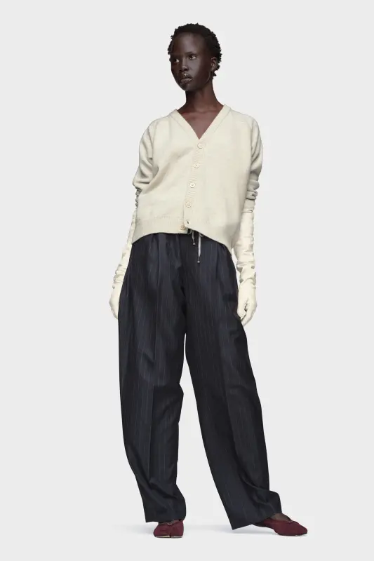 A soft cropped knit top in pure virgin wool, designed with a relaxed silhouette and ribbed finishes. Its deep V-neckline and tonal buttons offer a clean, pared-back finish. At the back, the Maison’s signature four stitches appear; the opposite of a label.