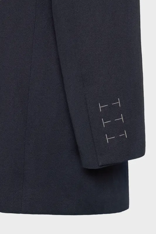 The tailored jacket, crafted from a virgin wool and linen blend, features the Maison's Work-in-progress contrast tack stitches at the cuffs. Elsewhere, it follows a classic silhouette with single-breasted front, pockets and notched lapels. Maison Margiela's signature, the four stitches, appear at the back; the opposite of a label.